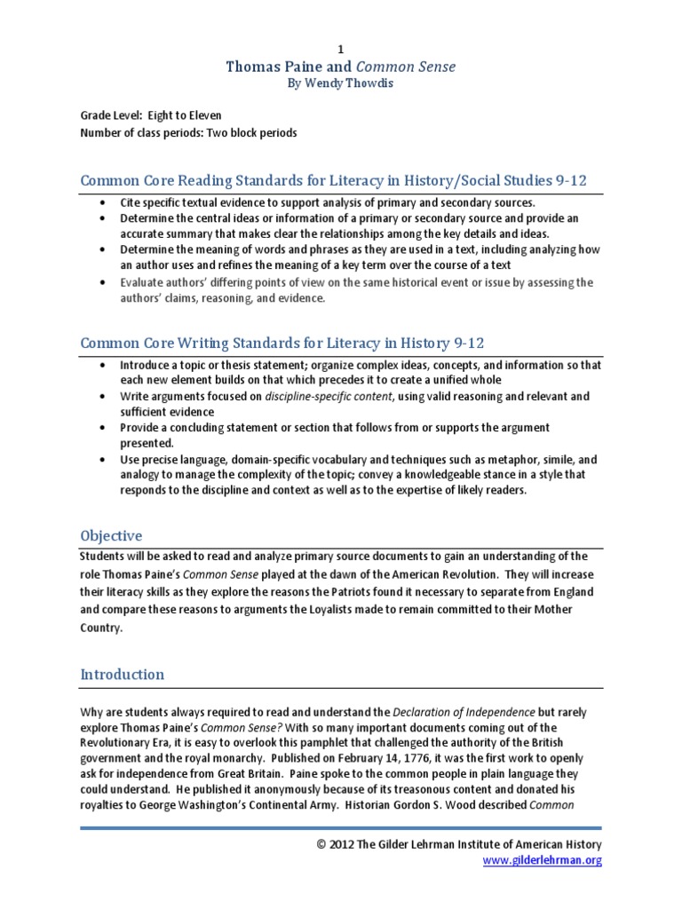 Thomas Paine S Common Sense Lesson Plan